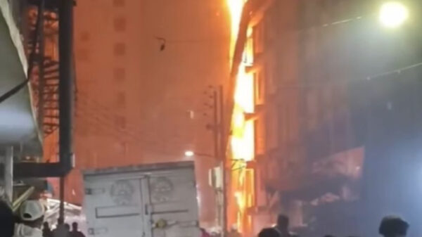 সামাজিক মাধ্যমে ছড়িয়ে পড়া একটি ভিডিওতে দেখা যায়, রাস্তার পাশের একটি বহুতল ভবনের একাংশ জুড়ে আগুন জ্বলছে।