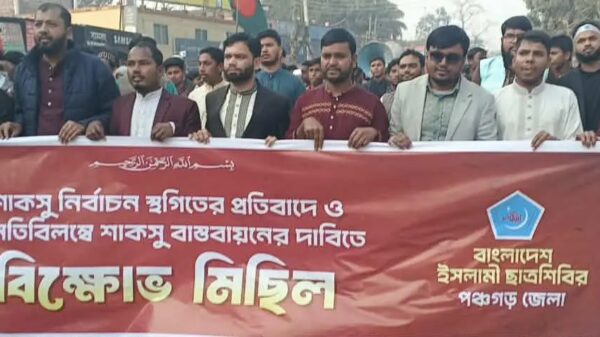 মনজু হোসেন, স্টাফ রিপোর্টার:: শাহজালাল বিজ্ঞান ও প্রযুক্তি বিশ্ববিদ্যালয় ছাত্র সংসদ (শাকসু) নির্বাচন স্থগিতের প্রতিবাদে এবং অনতিবিলম্বে শাকসু নির্বাচন বাস্তবায়নের দাবিতে বিক্ষোভ মিছিল করেছে বাংলাদেশ ইসলামী ছাত্রশিবির, পঞ্চগড় জেলা শাখা।