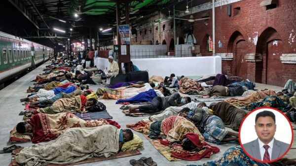 প্ল্যাটফর্মের মেঝেতে সারি সারি মানুষ। কেউ কাগজ পেতে, কেউ পুরনো চাদর জড়িয়ে, কেউবা খালি মেঝেতেই—ঘুমিয়ে আছে গভীর নিশ্চিন্ত ঘুমে।