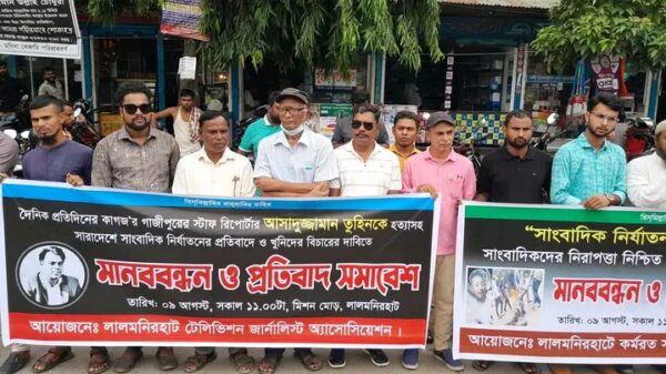 কেফায়েত উল্লাহ::মোঃ কেফায়েত উল্লাহ, লালমনিরহাট::গাজীপুরের সাংবাদিক আসাদুজ্জামান তুহিনকে কুপিয়ে হত্যার প্রতিবাদে লালমনিরহাটে মানববন্ধন ও প্রতিবাদ সমাবেশ অনুষ্ঠিত হয়েছে। শনিবার (৯ আগস্ট) সকালে শহরের মিশন মোড়ের গোলচত্বর এলাকায় এ কর্মসূচি পালন করেন জেলার কর্মরত সাংবাদিক ও সচেতন নাগরিকবৃন্দ।