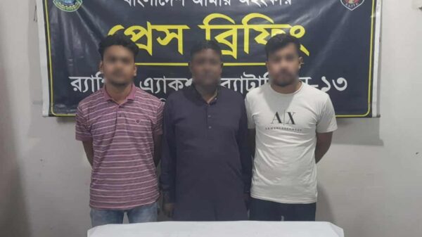র্যাব জানায়, বৃহস্পতিবার (২১ আগস্ট) রাত সাড়ে ৯টার দিকে র্যাব-১৩ এর সিপিসি-২ নীলফামারী ও সিপিসি-১ দিনাজপুর ক্যাম্পের যৌথ অভিযানে দিনাজপুর জেলার কোতোয়ালী থানার বড় মাঠ এলাকা থেকে নূর রাব্বী (২৬), আবু তালেব (২৫) ও কামাল হোসেন (৪০) নামের এজাহারনামীয় আসামিদের গ্রেফতার করা হয়।