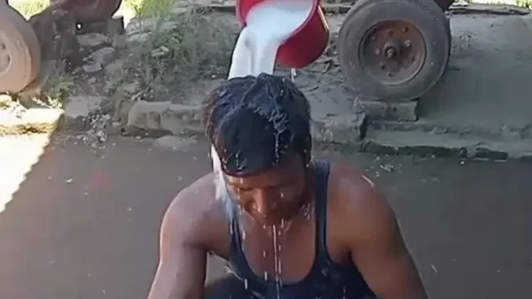 ভিডিওতে দেখা যায়, স্থানীয় কয়েকজন প্লাস্টিকের মগ ও বোতল দিয়ে আল আমিনের মাথায় দুধ ঢালছেন। উৎসুক জনতা তাঁকে ঘিরে দেখছেন। কেউ কেউ মুঠোফোনে সেই দৃশ্য ধারণ করছেন। দুধ ঢেলে গোসলের সময় আল আমিনকে বলতে শোনা যাচ্ছে, ‘আমি পিকআপ চালাই। জুয়া খেলে আমার জীবন শেষ। গত এক বছরে আমার ৮ লাখ টাকা গেছে। আমার ৪টি গাড়ির মধ্যে ২টি গাড়ি বিক্রি করেছি। আমি সবার কাছে দোয়া চাই। আমি যত দিন বেঁচে থাকব, ততদিন আর কোনোদিন জুয়া খেলব না। আমার এ দৃশ্য দেখে যদি কোনো একজন ব্যক্তি ভালো হয়ে যান, ভালো।’