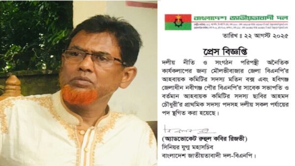 অনলাইন ডেস্ক::দলীয় নীতি ও সাংগঠনিক পরিপন্থী কর্মকাণ্ডের অভিযোগে মৌলভীবাজার জেলা বিএনপির আহ্বায়ক কমিটির সদস্য মতিন বক্স এর প্রাথমিক সদস্য পদসহ সব পর্যায়ের দলীয় পদ স্থগিত করেছে বাংলাদেশ জাতীয়তাবাদী দল (বিএনপি)। আরও পড়ুন